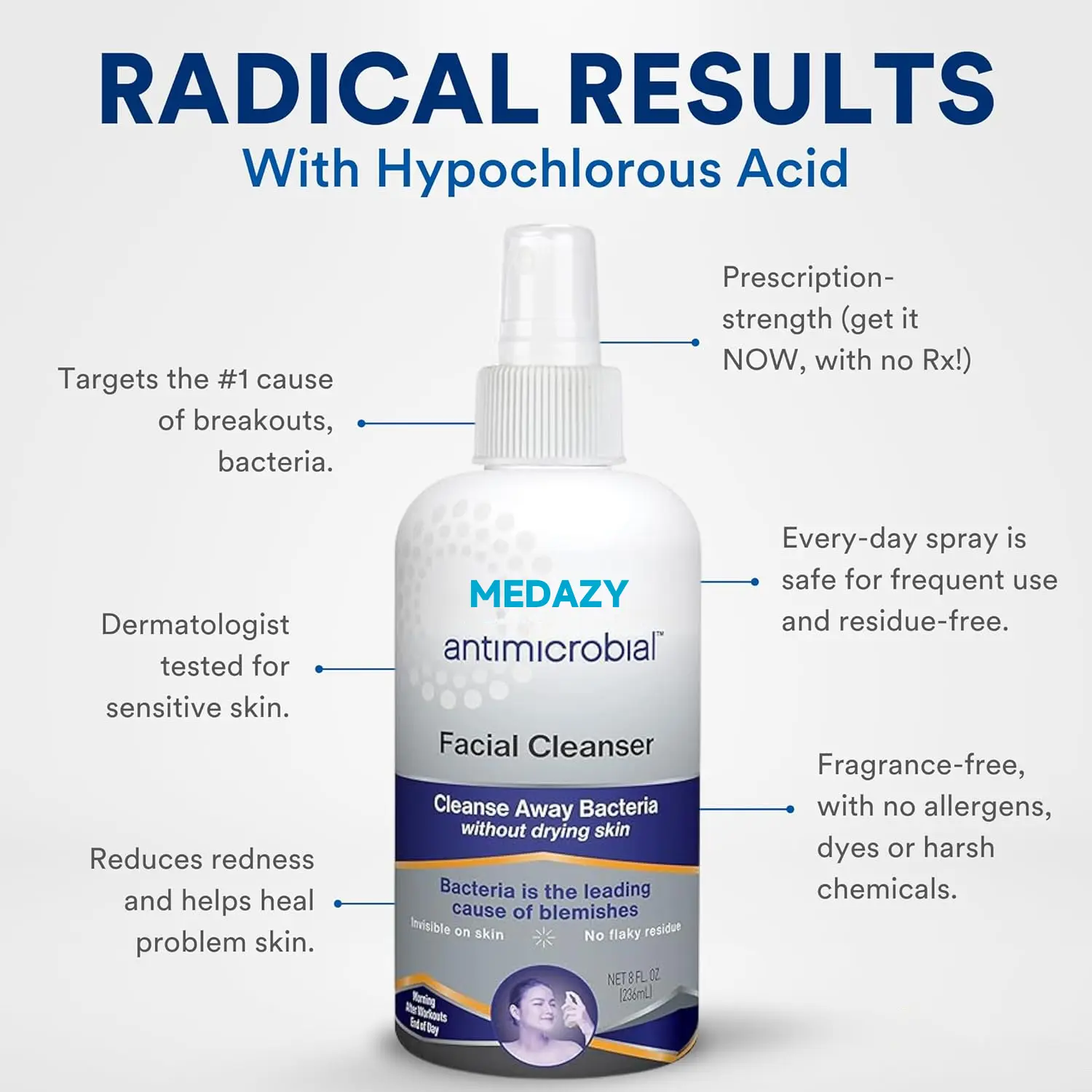 According to Dr. Collins, MD., a board-certified dermatologist in Los Angeles, “Medazy® Antimicrobial Facial Cleanser is highly effective for treating acne because it targets the bacteria causing breakouts without causing irritation. Hypochlorous acid is a well-known antimicrobial ingredient that not only kills bacteria but also soothes the skin, making it perfect for anyone dealing with acne or skin sensitivity.”